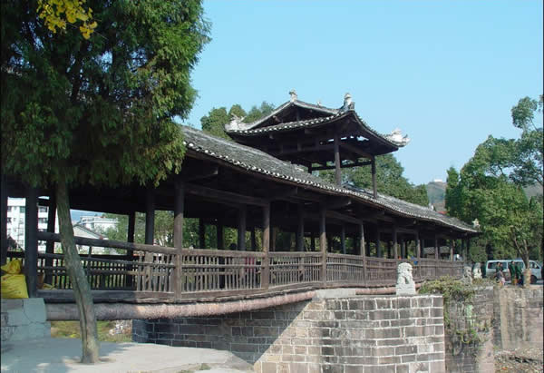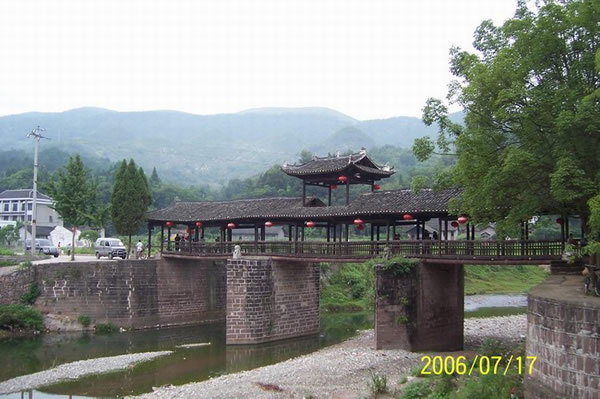 | 賀龍橋原名永安橋,是賀龍曾祖父賀廷宰首倡修建的,它是一座由石墩、木梁、騎廊組成的風雨橋。賀廷宰熱心公益事業(yè),見玉泉河“奔流湍急,道路為!保腥耸植槐,于是決定修橋。由于他只是一個教私塾的文人,修橋工程艱巨,個人經費有限,“至斥腴畝以償其負”。后來,賀龍的祖父賀良仕子代父勞,費盡心血,終于在1915年修建成功,深獲遠近鄉(xiāng)鄰稱頌。